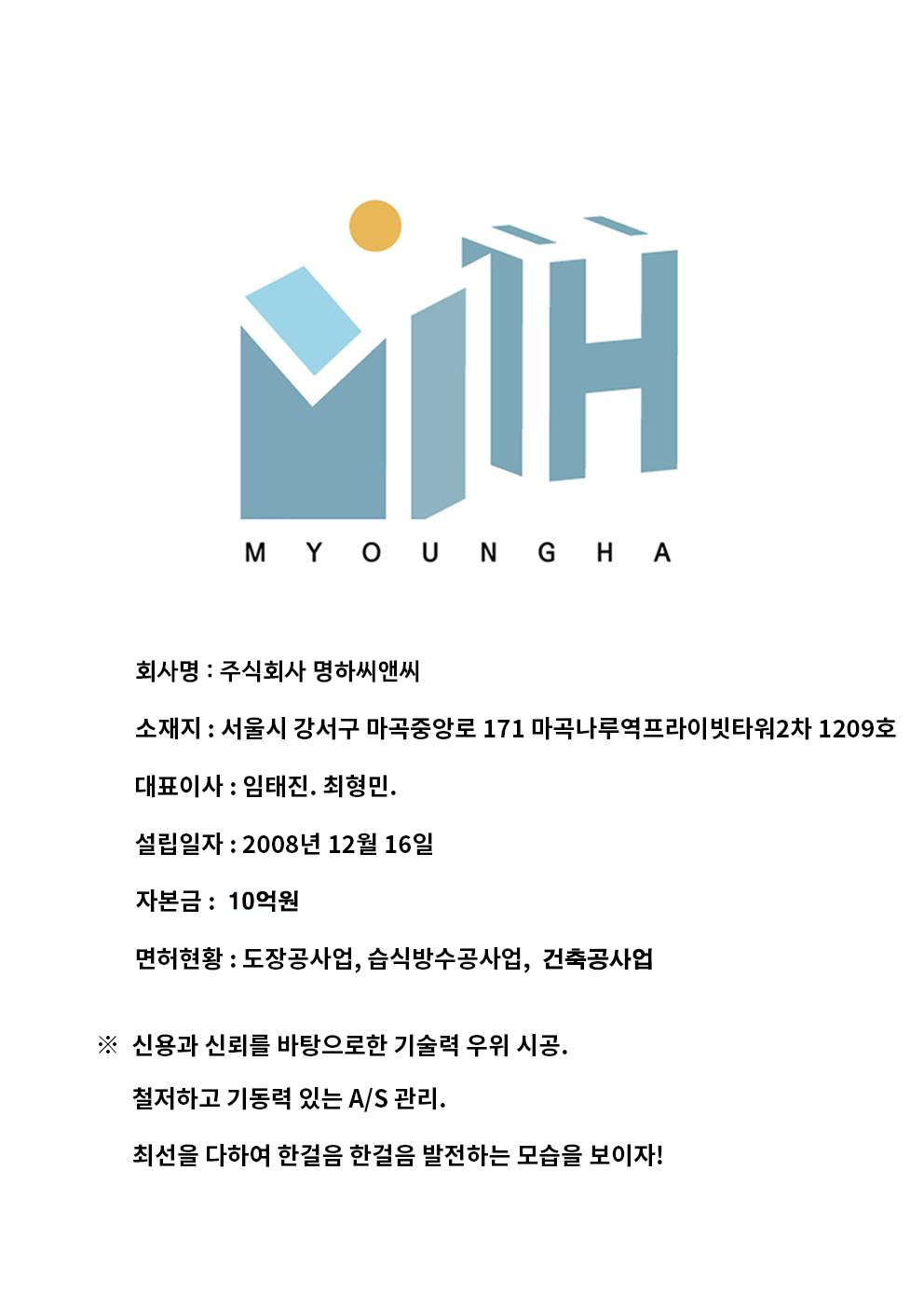 (ÁÖ)¸íÇϾ¾¾Ø¾¾ ÀÓÅÂÁø,ÃÖÇü¹Î ¼¿ï½Ã °¼±¸ ¸¶°îÁß¾Ó·Î 171 ¸¶°î³ª·ç¿ªÇÁ¶óÀ̺øÅ¸¿ö2Â÷ 1209È£ 502-81-98668 Tel – 02)3662-8370 email - myoungha1@hanmail.net